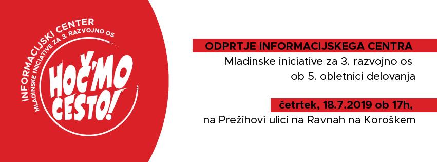 Peti obletnici delovanja Mladinske iniciative za 3. razvojno os bo posvečeno odprtje informacijskega centra na Ravnah na Koroškem na Prežihovi ulici, ki bo s kratkim kulturnim programom potekalo v četrtek, 18. julija 2019, to je prav na dan pete obletnice uvodne javne predstavitve Mladinske iniciative za 3. razvojno os.