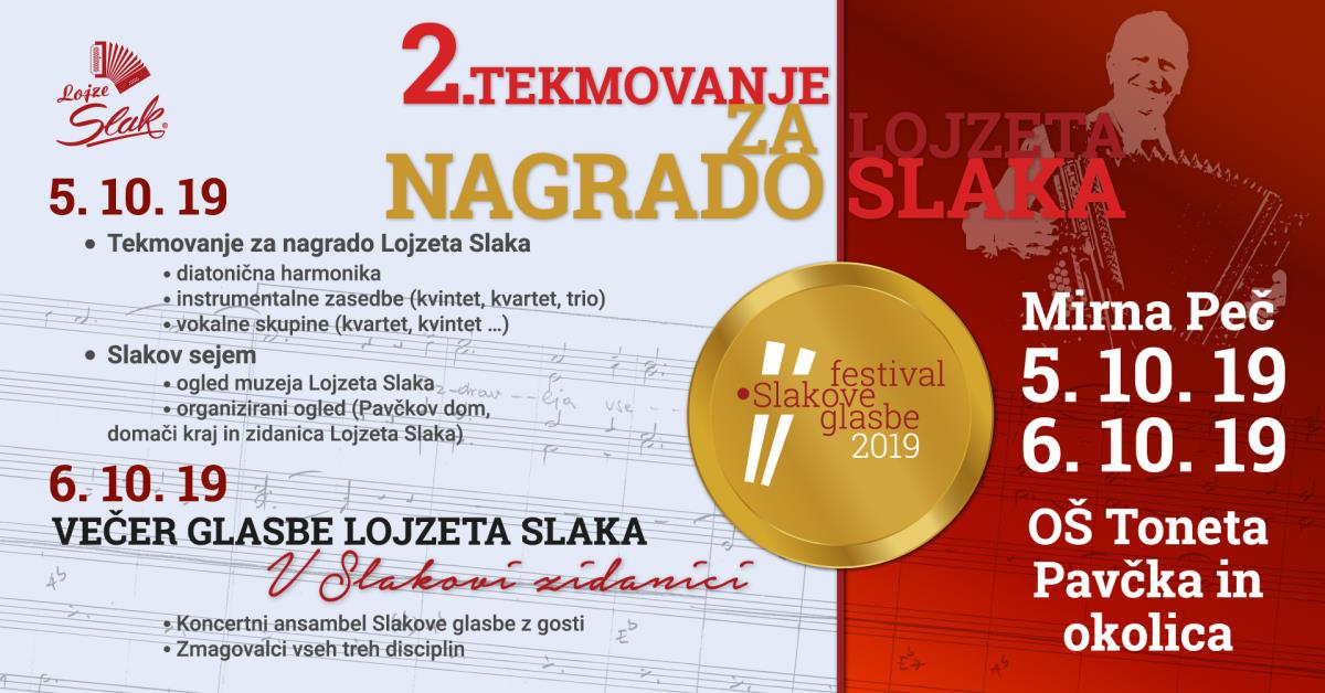 V Mirni Peči na Dolenjskem je 5. in 6. oktobra 2019 v okviru Festivala Slakove glasbe potekalo 2. tekmovanje za nagrado Lojzeta Slaka. Nastopila sta dva učenca Glasbene šole Ravne na Koroškem pod mentorstvom učitelja Jožeta Mandla.