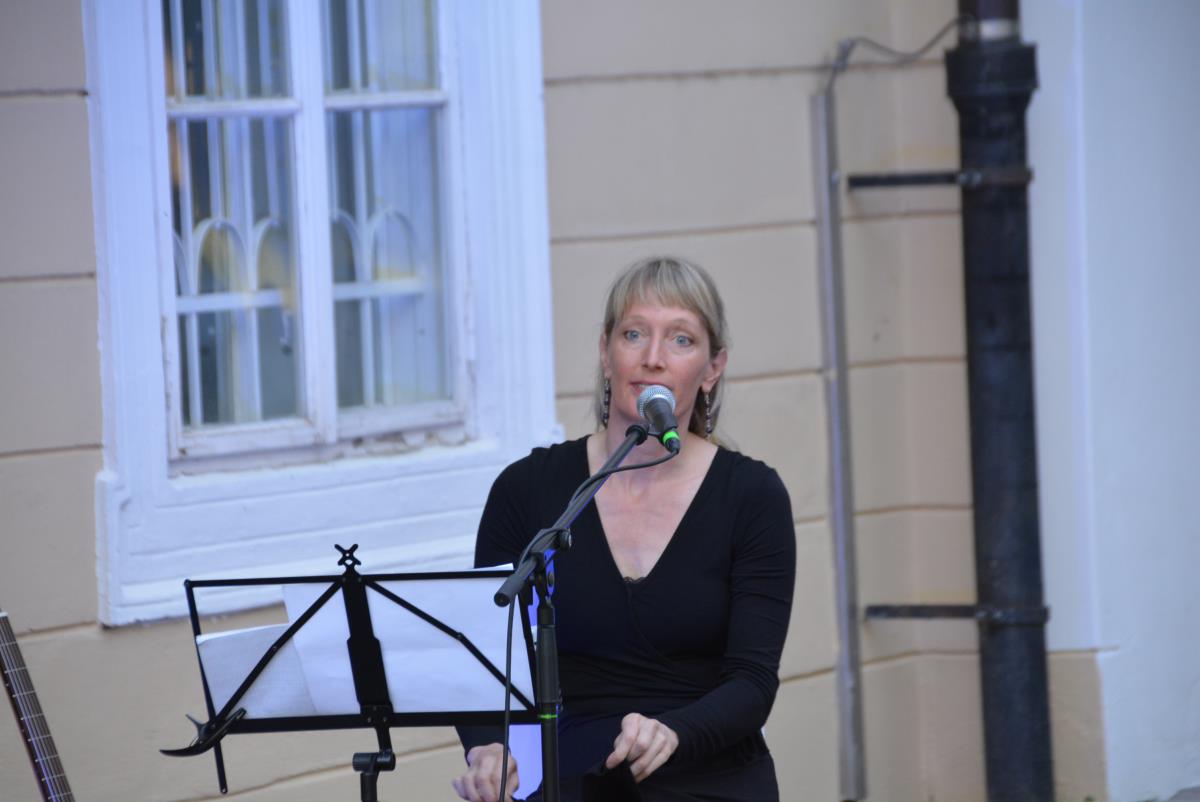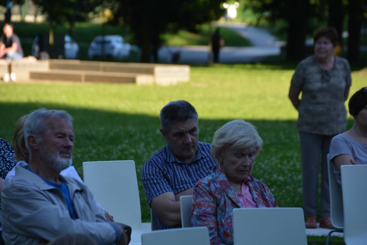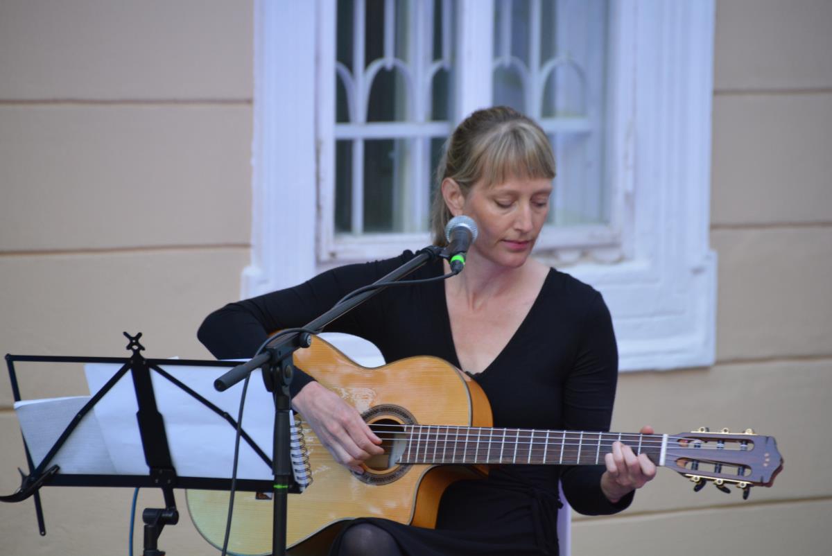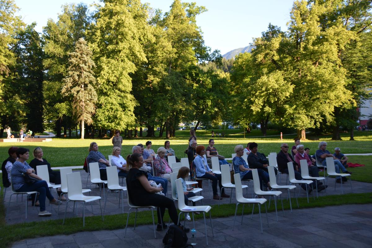 V prijetnem ambientu grajskega vrta Koroške osrednje knjižnice, je na topel petkov večer potekal zanimiv glasbeno obarvan kulturni dogodek. Prisluhnili smo namreč uglasbeni poeziji Sreča Kosovela in Alme Karlin z Niko Solce.