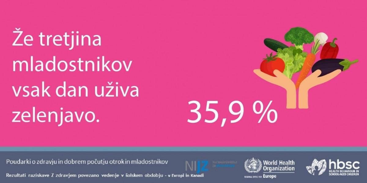 - Slovenski mladostniki, stari 11, 13 in 15 let, vse pogosteje redno uživajo zelenjavo in sadje in vse manj je tistih, ki pogosto posegajo po sladkanih pijačah, je pokazala raziskava Z zdravjem povezano vedenje v šolskem obdobju med mladostniki v Sloveniji (HBSC, 2018).