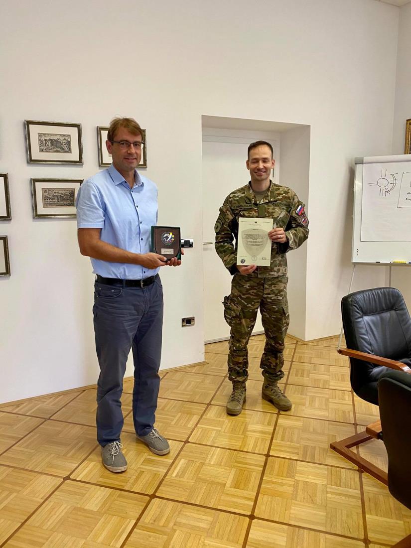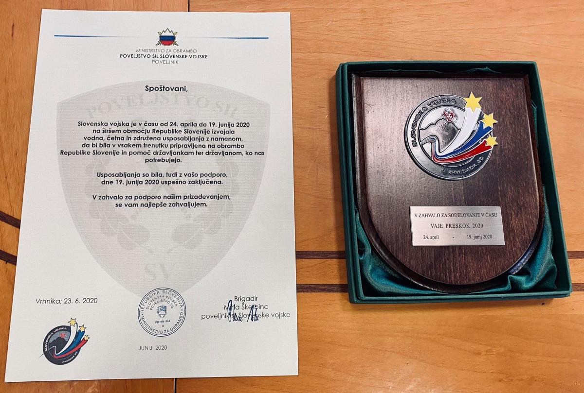 Pripadniki Slovenske vojske so se županu dr. Tomažu Roženu in Občini Ravne na Koroškem zahvalili za naklonjenost projektu letošnje vojaške vaje Preskok 2020 in za zgledno dosedanje sodelovanje, s simbolično spominsko plaketo.
