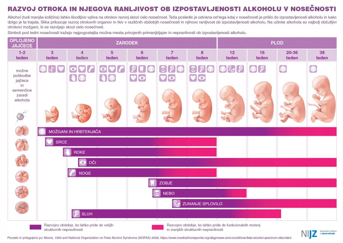 Alkohol je celični strup in teratogen ter povzroča nepravilnosti v razvoju in rasti otroka. Ker se otrok razvija in raste skozi celo nosečnost, je lahko ob izpostavljenosti alkoholu moten razvoj njegovih organov in tkiv kadarkoli v nosečnosti, tudi še preden ženska ve, da je noseča. Na učinke alkohola so najbolj občutljivi otrokovi možgani, ki se razvijajo skozi celo nosečnost. Posledice izpostavljenosti alkoholu v nosečnosti so lahko splav, odmrtje ploda, zaostanek v rasti, rojstvo otroka s spektrom fetalnih alkoholnih motenj (FASD), tudi nenadna smrt dojenčka. FASD je skupno ime za različne prirojene nepravilnosti in primanjkljaje v razvoju otroka, ki izvirajo iz izpostavljenosti alkoholu pred rojstvom in se kažejo na telesnem, miselnem in duševnem področju. Za osebe s FASD so značilne spremembe v delovanju možganov, kar je pogosto prepoznano šele v šolskem obdobju, ko otrok ne zmore izpolniti vseh zadolžitev in pričakovanj. Če otrok s FASD ni prepoznan in ustrezno obravnavan, obstaja tudi veliko tveganje za mnoge oviranosti v odrasli dobi.
