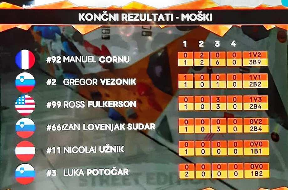 V večerni finale, ki smo ga lahko spremljali tudi na Planet TV2 sta se uvrstila tudi oba Ravenčana, člana slovenske reprezentance v športnem plezanju Gregor Vezonik in Zan Sudar Lovenjak, ki sta ob odličnih nastopih na koncu osvojila 2. in 4. mesto. Za kar jima iskreno čestitamo! Zmagal je Francoz Manuel Cornu, tretji pa je bil Američan Ross Fulkerson.