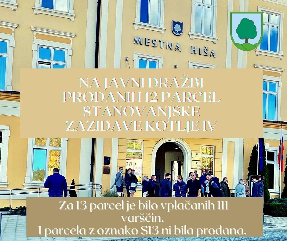 Javna dražba za prodajo nepremičnin, 13 gradbenih parcel (stanovanjska zazidava Kotlje IV), ki ležijo na zemljiških parcelah št. 349 in 350, k. o. 896 - Kotlje je potekala v prostorih Občine Ravne na Koroškem v četrtek, 4. 11. 2021, od 11. ure dalje.