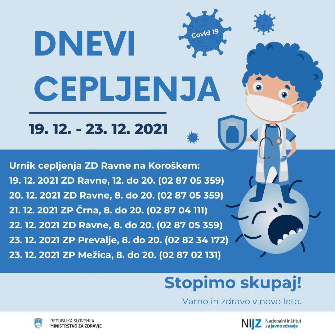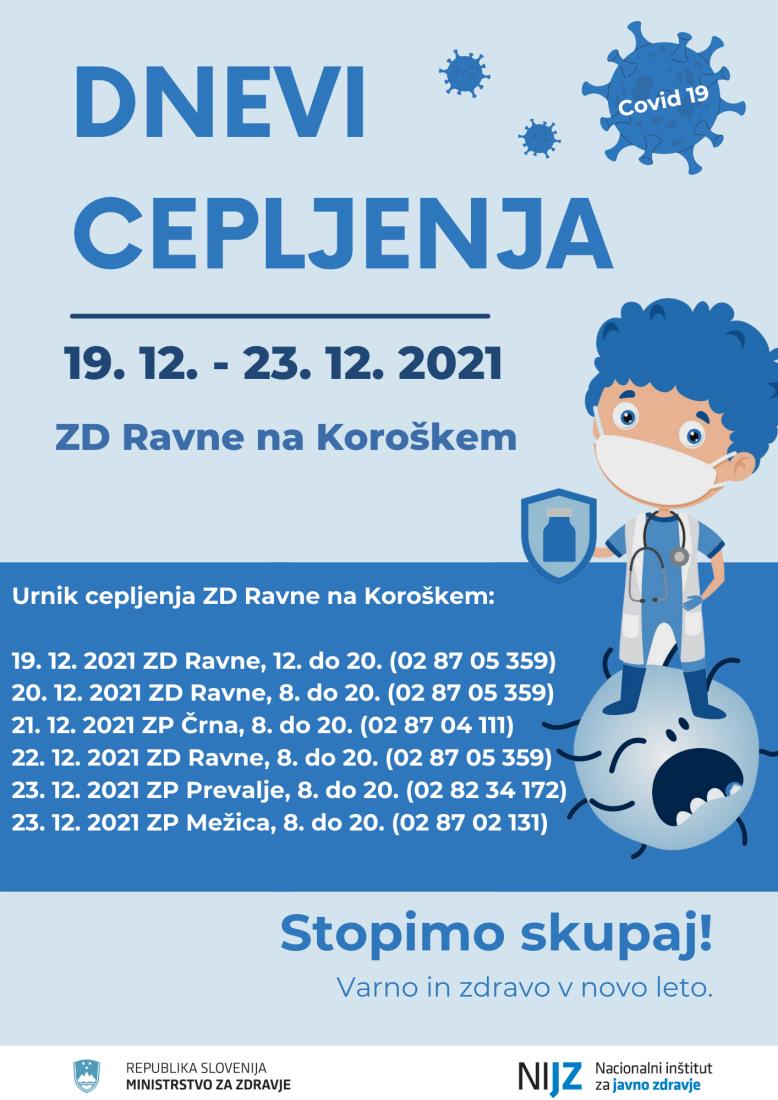 Minister za zdravje Janez Poklukar je pred decembrskimi prazniki napovedal akcijo Dneve cepljenja, pod geslom 'Stopimo skupaj! Varno in zdravo v novo leto'. Da bi cepljenje približali vsem občankam in občanom občine Ravne na Koroškem in širše v Mežiški dolini, bodo dnevi cepljenja potekali tudi v ZD Ravne na Koroškem in njegovih zdravstvenih postajah.