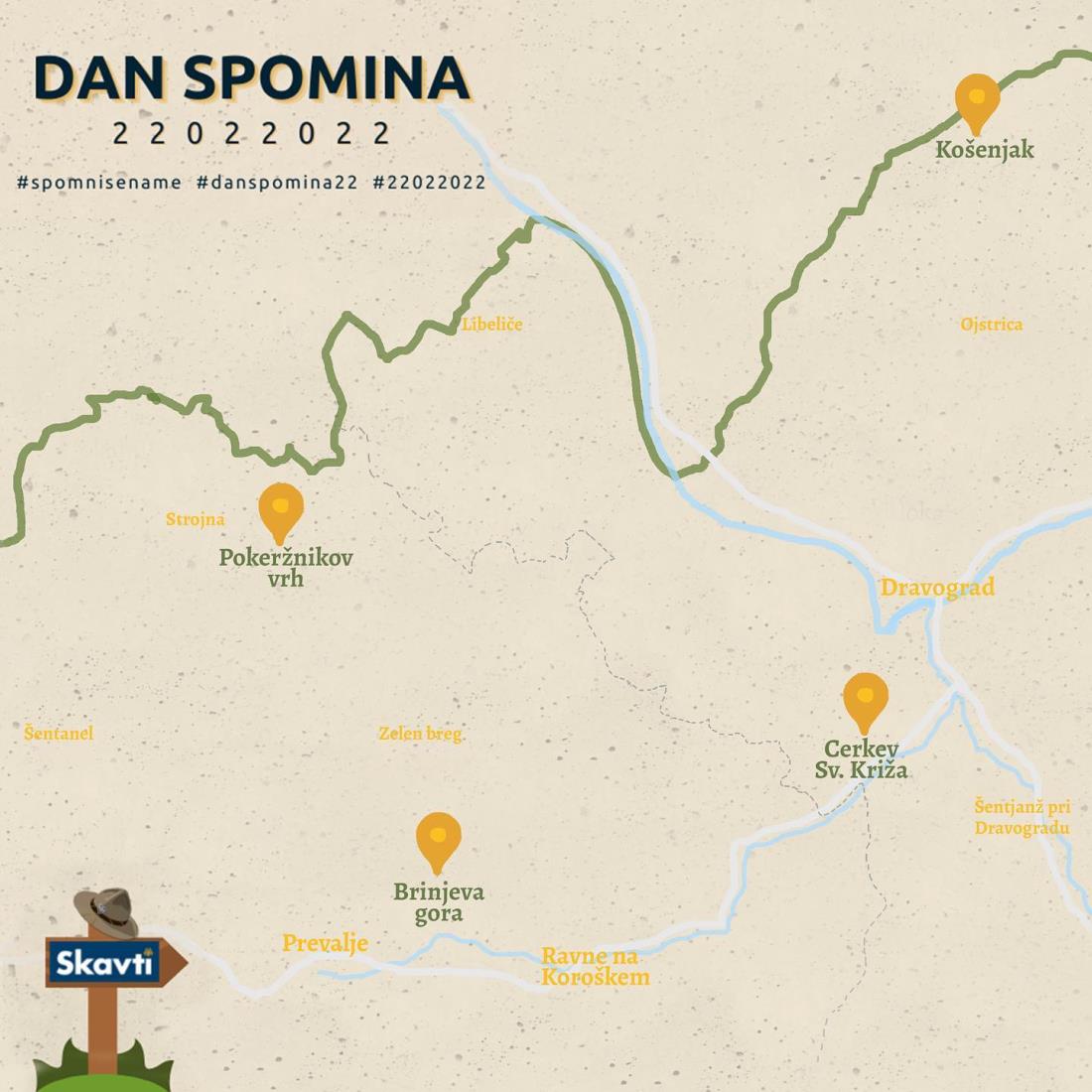 Vsa navodila in zemljevid točk najdete na spletni strani https://izzivajuzivaj.si/dan-spomina, na družbenih omrežjih (Facebook Skavtinje in skavti, Instagram skavti_slovenija oziroma Facebook Skavti Koroška Dva, Instagram skavti_koroska_2). Akcija je del projekta Izzivaj - uživaj 2.0, ki ga Skavti izvajamo pod okriljem Ministrstva za zdravje RS.
