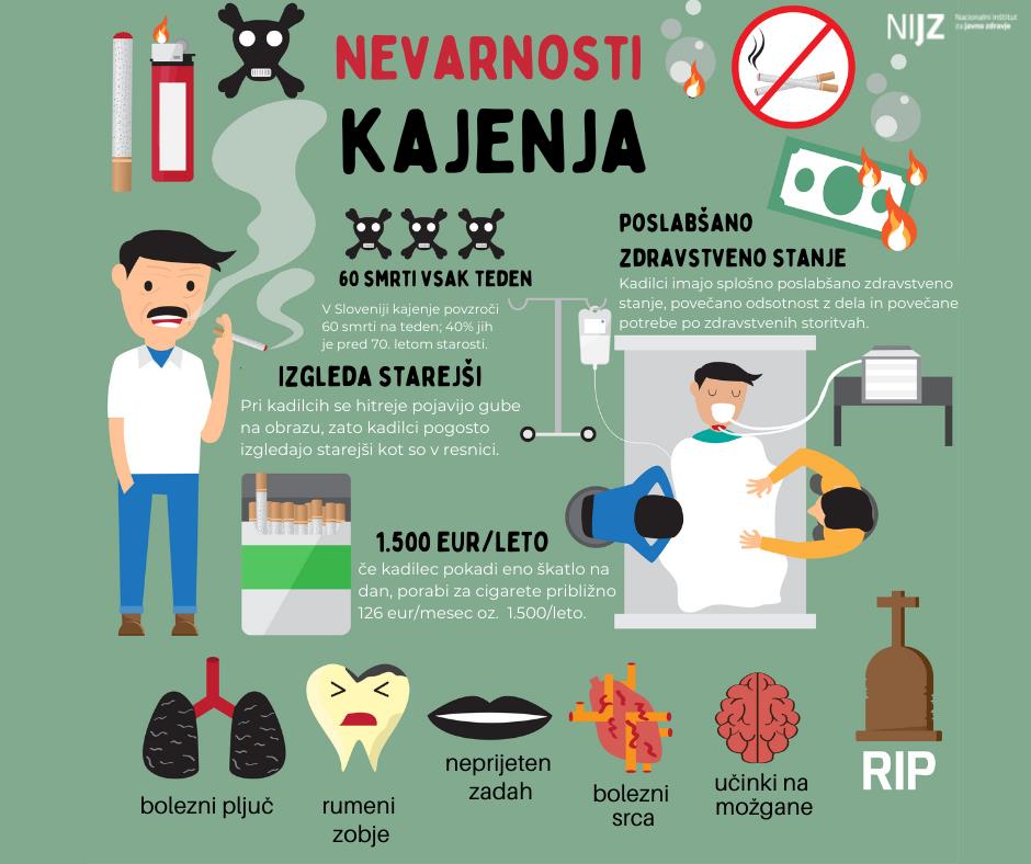 Vsako leto 31. maja obeležujemo Svetovni dan brez tobaka, ki je letos posvečen škodljivim vplivom tobaka na okolje in poteka pod geslom »Tobak ogroža tudi okolje«. Tobak ne škoduje le zdravju posameznikov, ampak ogroža tudi okolje. Vpliv tobačne industrije in njihovih izdelkov na okolje je pogosto spregledan, čeprav gre za obsežen in naraščajoč problem, ki povečuje nepotrebni pritisk na že tako omejene vire in krhke ekosisteme našega planeta. Vsak posameznik lahko veliko naredi za zmanjšanje vplivov na okolje, predvsem z opustitvijo kajenja ali uporabe sorodnih izdelkov ter s podporo ukrepom nadzora nad tobakom. Podatki kažejo, da se razširjenost kajenja v Sloveniji zmanjšuje, vse, ki kadijo, pa spodbujamo k opustitvi kajenja. V Sloveniji je bila pred kratkim sprejeta Strategija za zmanjševanje posledic rabe tobaka 2022-2030, ki vključuje ukrepe nadzora nad tobakom za nadaljnje zmanjševanje razširjenosti kajenja in uporabe sorodnih izdelkov, kar bo vodilo v zmanjševanje obolevnosti in umrljivosti in tudi zmanjševanje škodljivih učinkov na okolje. V strategiji si Slovenija zastavlja tudi cilj družba brez tobaka 2040.