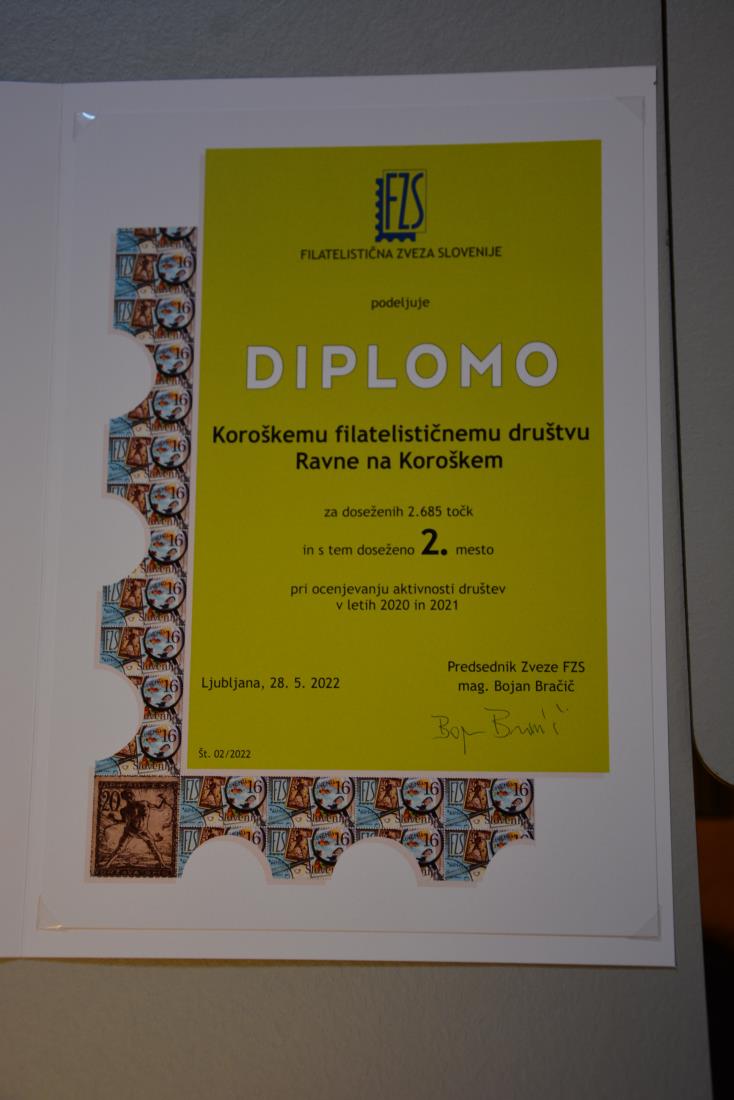 Dvoletno točkovanje dela društev je pokazalo, da so člani Koroškega filatelističnega društva dosegli zavidljivo 2. mesto za delo v letih 2020 in 2021 in za svoje delo prejeli priznanje. In ne samo to. Filatelistična zveza nagradi s priznanji tudi zaslužne filateliste in med njimi so tudi člani našega društva. Borut Bončina je prejel bronasto odličje Lovrenc Košir, Izidor Jamnik srebrno odličje Lovrenc Košir, Jože Keber zlato odličje Lovrenc Košir.
