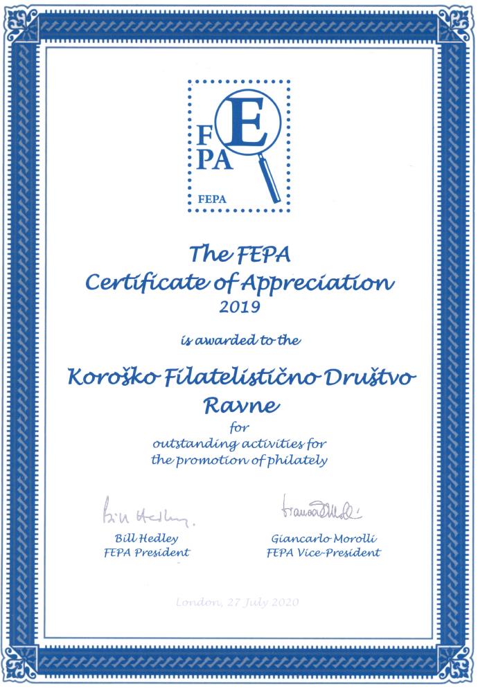Nagrajenci so bili vsi priznani kot promotorji filatelije v medijih in s propagandnimi razstavami, raziskovanju in proučevanju filatelističnega gradiva in delu v domačem društvu ter širše. To so še nova priznanja za aktivne člane društva, kar je v letu 2020 prepoznala tudi Evropska filatelistična organizacija - FEPA, ki je KFD podelila Certifikat za izjemno dejavnost pri promociji filatelije. Takšno priznanje FEPA je v letu 2020 dobilo samo 5 filatelističnih društev v Evropi, KFD pa je eno redkih društev v Sloveniji, ki se ponaša s tem naslovom. Priznanje je FEPA podelila 27.7.2020. Slavnostno je bilo priznanje dne 1.3.2022 izročeno na otvoritvi razstave MAKSI RAVNE 2022.