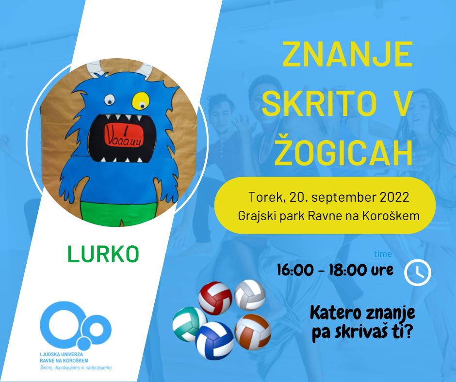 LURKO je vedoželjna, lačna in prijazna pošast. Ima vedno odprta usta, saj nikoli ni sit. Tokrat ga bomo poskušali nahraniti S SKRITIM ZNANJEM, ki se skriva v žogicah. Udeleženci dogodka nam bodo zaupali, katero znanje je skrito v žogici, s katero ga bodo nahranil. Pomerili se bomo v metanju žogic v tarčo oziroma Lurkova usta.