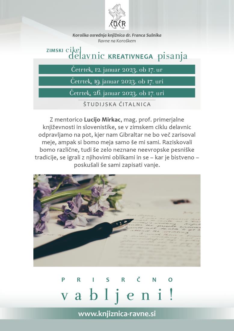 Kreativne delavnice bodo potekale ob četrtkih ob 17. uri. Januarski termini so: 12., 19. in 16. januar. Mentorica je Lucija Mirkac, mag. prof. primerjalne književnosti in slovenistike.