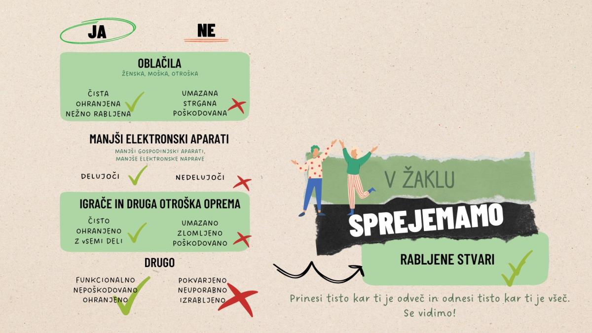 Kako skrbimo mi za naše okolje? Eni boljše, drugi slabše, a sedaj se nam vsem ponuja priložnost. Priložnost, da svoje odvečne, a povsem uporabne stvari ne zavržemo in jih raje odnesemo tja, kjer bodo dobile drugo možnost. Dobili smo priložnost, da svoj nakup ne opravimo v trgovini, kjer so poceni izdelki zato, ker je ceno plačal že nekdo drug v samem procesu, ampak ga lahko opravimo tam, kjer bomo naredili nekaj dobrega za okolje in lokalno skupnost.