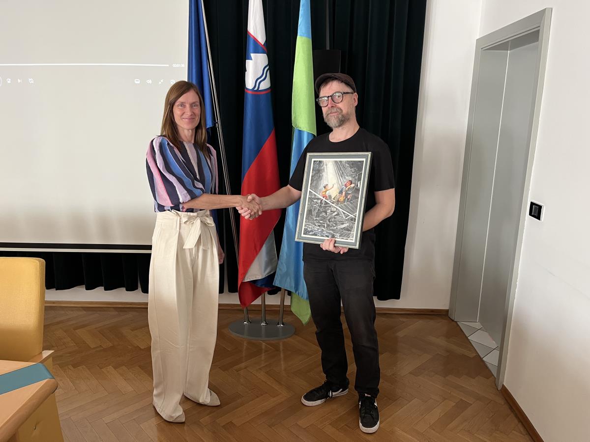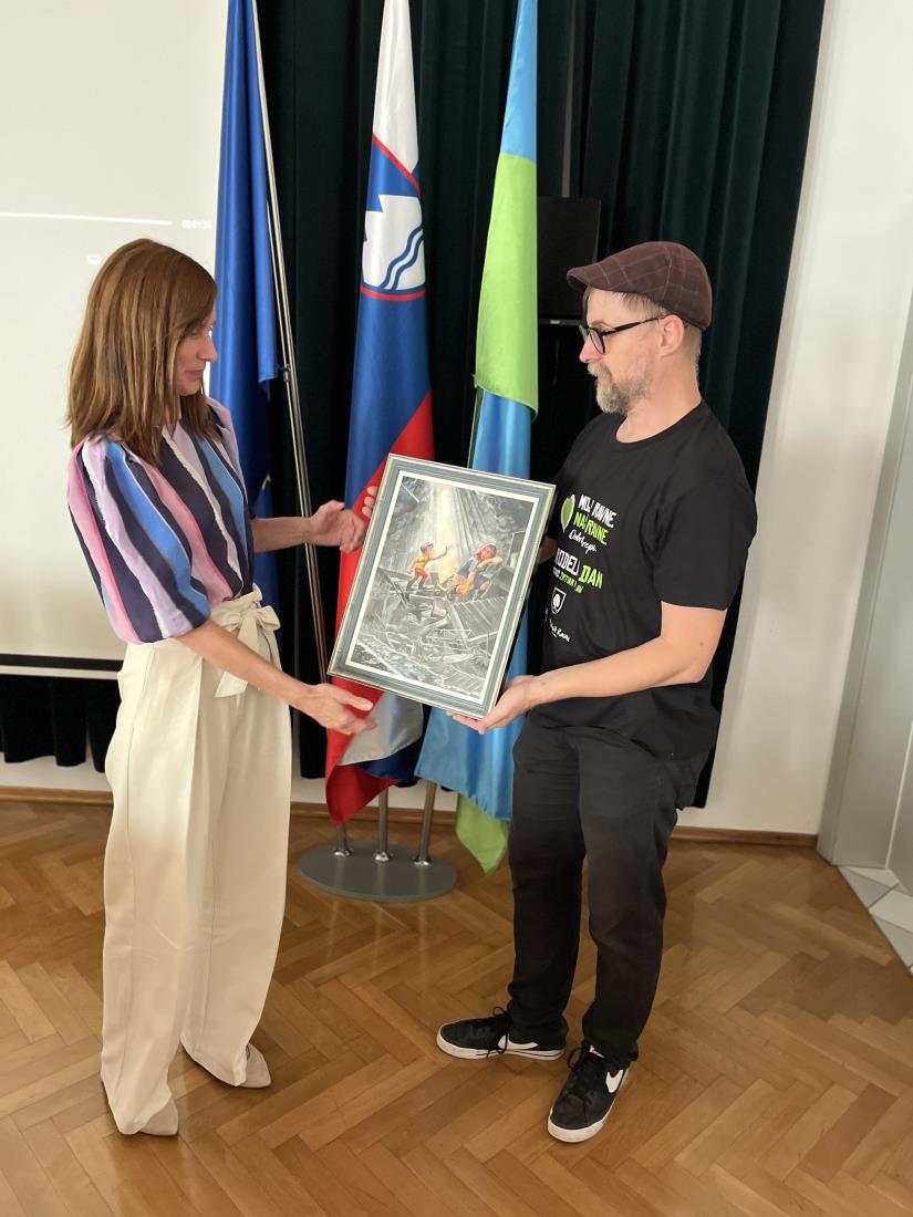 Karikaturo je ob županovi nujni zadržanosti prevzela direktorica občinske uprave, mag. Vlasta Kupljen.