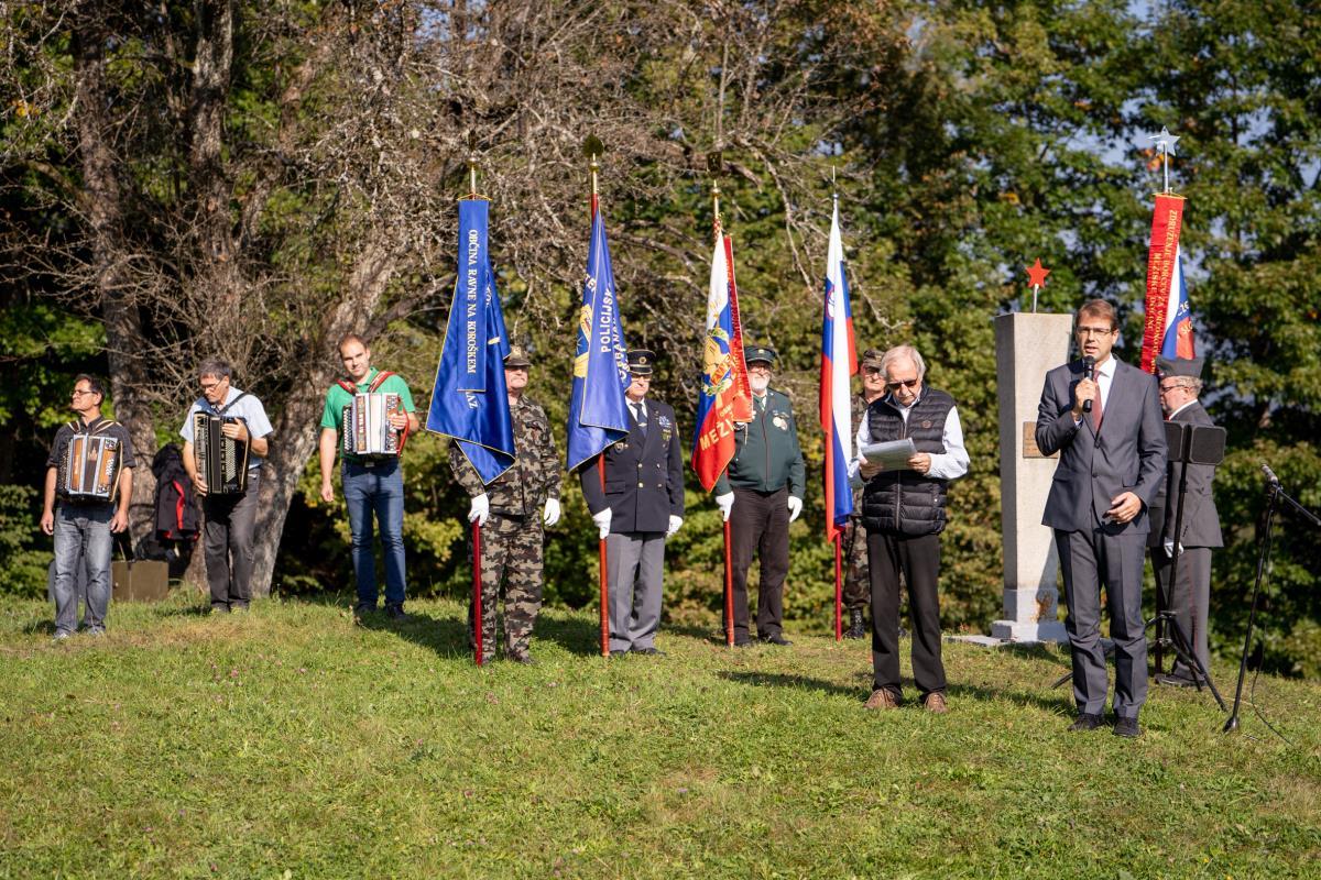 Prisluhnili smo pozdravnemu govoru županu Občine Ravne na Koroškem dr. Tomažu Roženu. Venec sta k spomeniku položila Mirko Rozman, predsednik ZB za vrednote NOB Prevalje in Zdravko Moličnik, podpredsednik Območnega združenja veteranov vojne za Slovenijo Mežiška dolina.