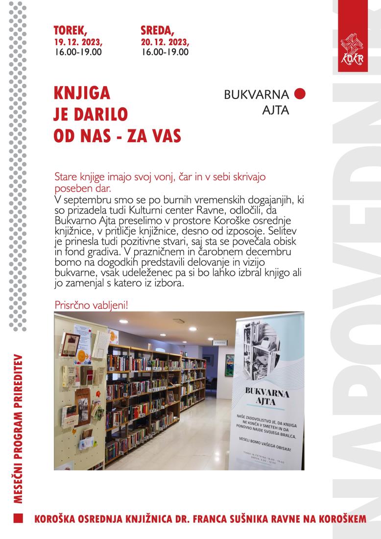 V septembru smo se po burnih vremenskih dogajanjih, ki so prizadela tudi Kulturni center Ravne, odločili, da Bukvarno Ajta preselimo v prostore Koroške osrednje knjižnice, v pritličje knjižnice, desno od izposoje. Selitev je prinesla tudi pozitivne stvari, saj sta se povečala obisk in fond gradiva. V prazničnem in čarobnem decembru bomo na dogodkih predstavili delovanje in vizijo bukvarne, vsak udeleženec pa si bo lahko izbral knjigo ali jo zamenjal s katero iz izbora.