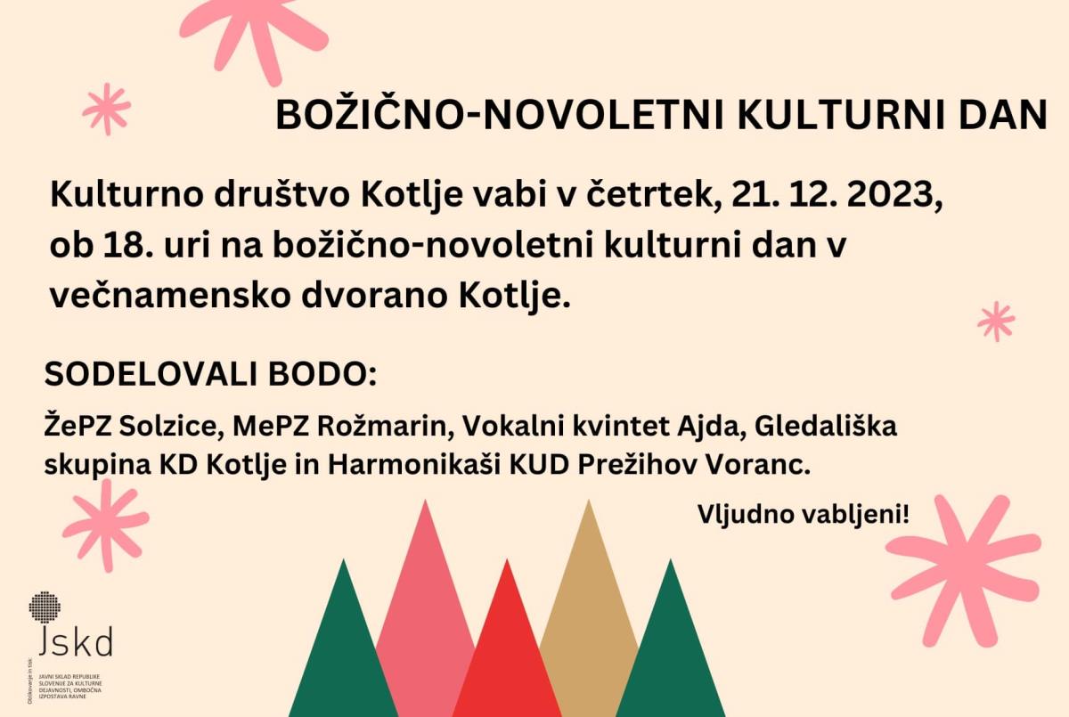 Vabljeni na božično-novoletni kulturni dan, ki bo naslednji četrtek, 21. decembra 2023, ob 18. uri v večnamenski dvorani v Kotljah.