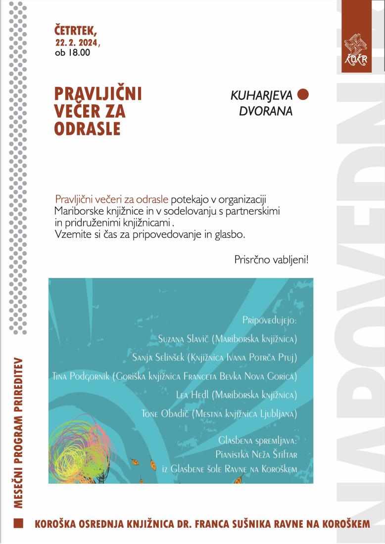 Pravljični večeri za odrasle potekajo v organizaciji Mariborske knjižnice in v sodelovanju s partnerskimi in pridruženimi knjižnicami. Vzemite si čas za pripovedovanje in glasbo.