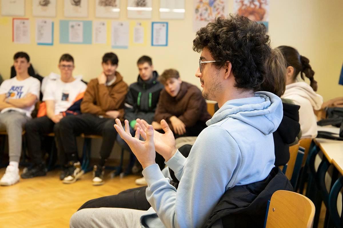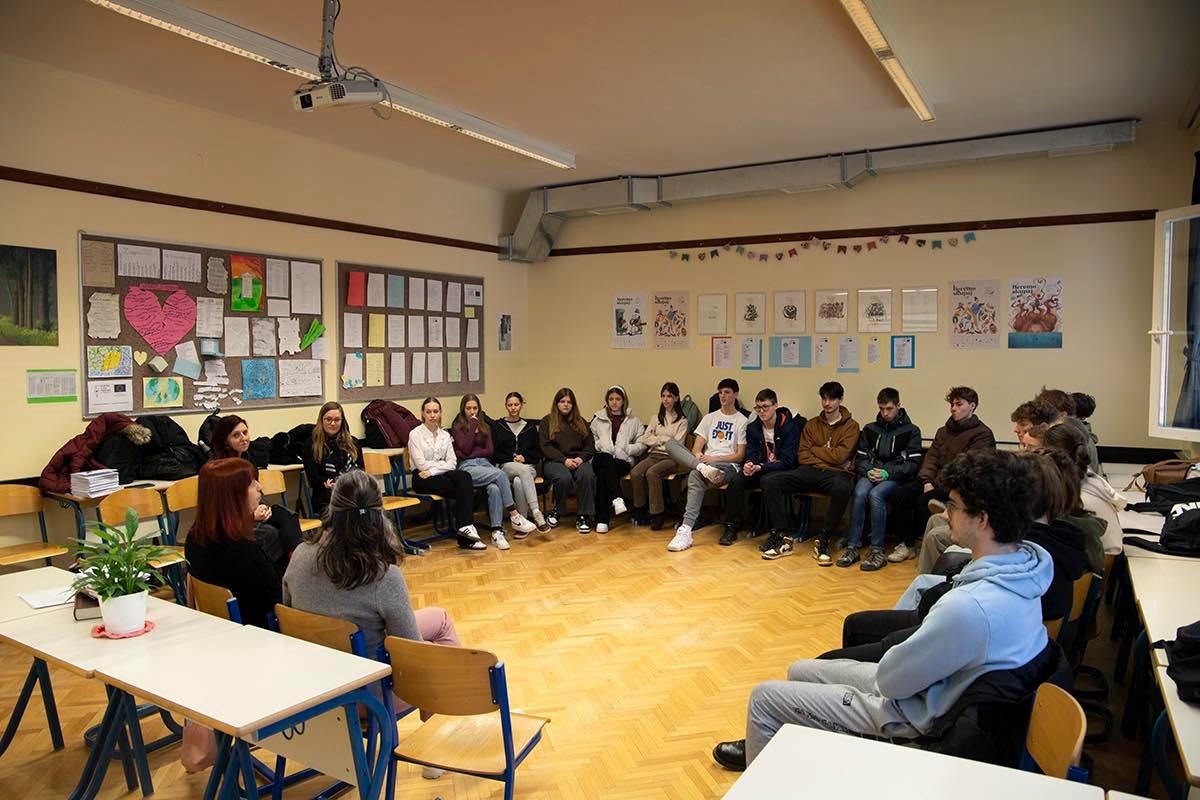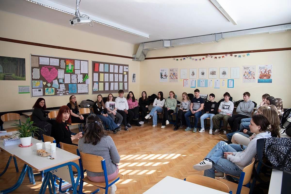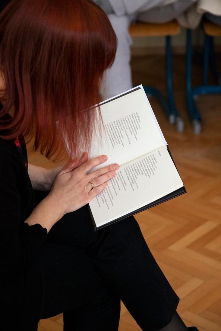 Njihova gostja je bila slovensko-makedonska pesnica Lidija Dimkovska, ki jo je druženje z gimnazijci ganilo in navdušilo. Pesnica, pisateljica, prevajalka in urednica Lidija Dimkovska že 15 let živi in deluje v Sloveniji, ustvarja pa v makedonščini. V Skopju je diplomirala iz primerjalne književnosti, v Bukarešti doktorirala iz romunske književnosti. Objavila je sedem pesniških zbirk in štiri romane, zbirko kratkih zgodb ter uredila štiri antologije. Njena dela so prevedena v številne tuje jezike, v slovenščini lahko prebiramo pesniške zbirke Mejno stanje, Črno na belem, Nobel proti Nobelu in pH nevtralna za življenje in smrt ter romane Skrita kamera, Rezervno življenje, Non-oui in EMŠO; je dobitnica mnogih literarnih nagrad.