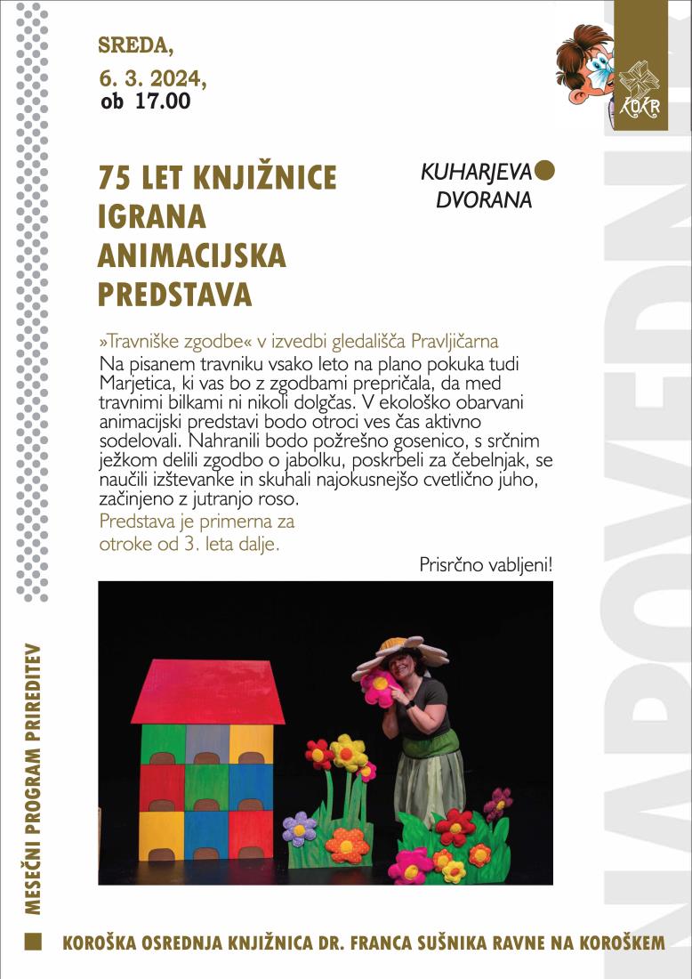 Na pisanem travniku vsako leto na plano pokuka tudi Marjetica, ki vas bo z zgodbami prepričala, da med travnimi bilkami ni nikoli dolgčas. V ekološko obarvani animacijski predstavi bodo otroci ves čas aktivno sodelovali. Nahranili bodo požrešno gosenico, s srčnim ježkom delili zgodbo o jabolku, poskrbeli za čebelnjak, se naučili izštevanke in skuhali najokusnejšo cvetlično juho, začinjeno z jutranjo roso.