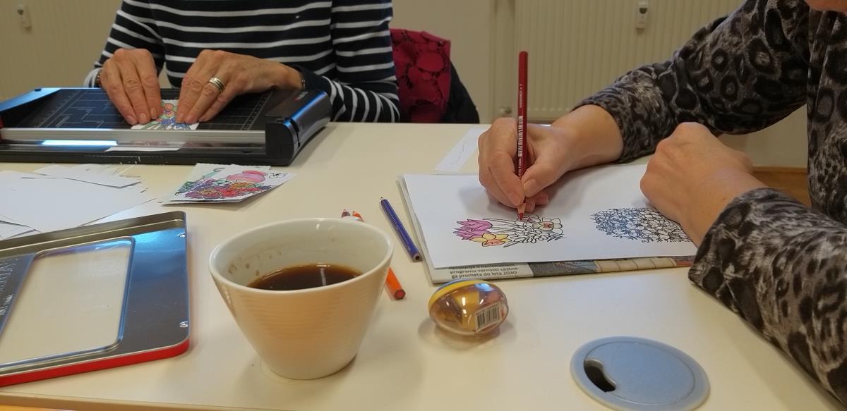 Na delavnici ustvarjamo voščilnice, čestitke in pobarvanke, ki krasijo stene naših prostorov in so darila za naše goste.