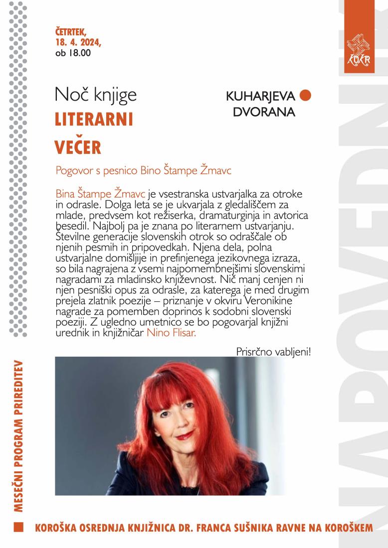 Bina Štampe Žmavc je vsestranska ustvarjalka za otroke in odrasle. Dolga leta se je ukvarjala z gledališčem za mlade, predvsem kot režiserka, dramaturginja in avtorica besedil. Najbolj pa je znana po literarnem ustvarjanju. Številne generacije slovenskih otrok so odraščale ob njenih pesmih in pripovedkah. Njena dela, polna ustvarjalne domišljije in prefinjenega jezikovnega izraza, so bila nagrajena z vsemi najpomembnejšimi slovenskimi nagradami za mladinsko književnost. Nič manj cenjen ni njen pesniški opus za odrasle, za katerega je med drugim prejela zlatnik poezije – priznanje v okviru Veronikine nagrade za pomemben doprinos k sodobni slovenski poeziji. Z ugledno umetnico se bo pogovarjal knjižni urednik in knjižničar Nino Flisar.