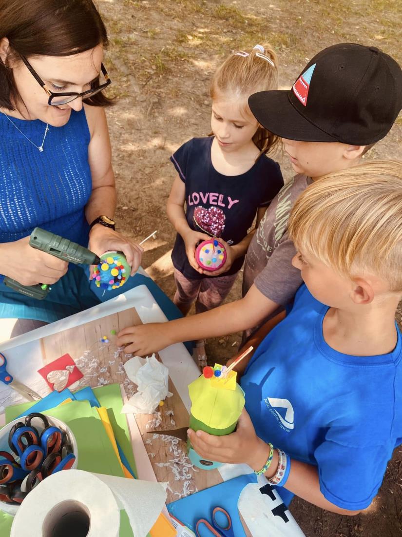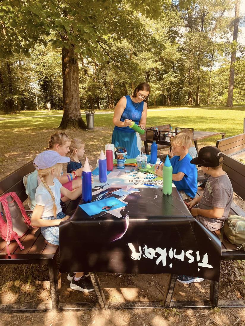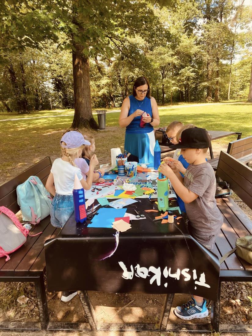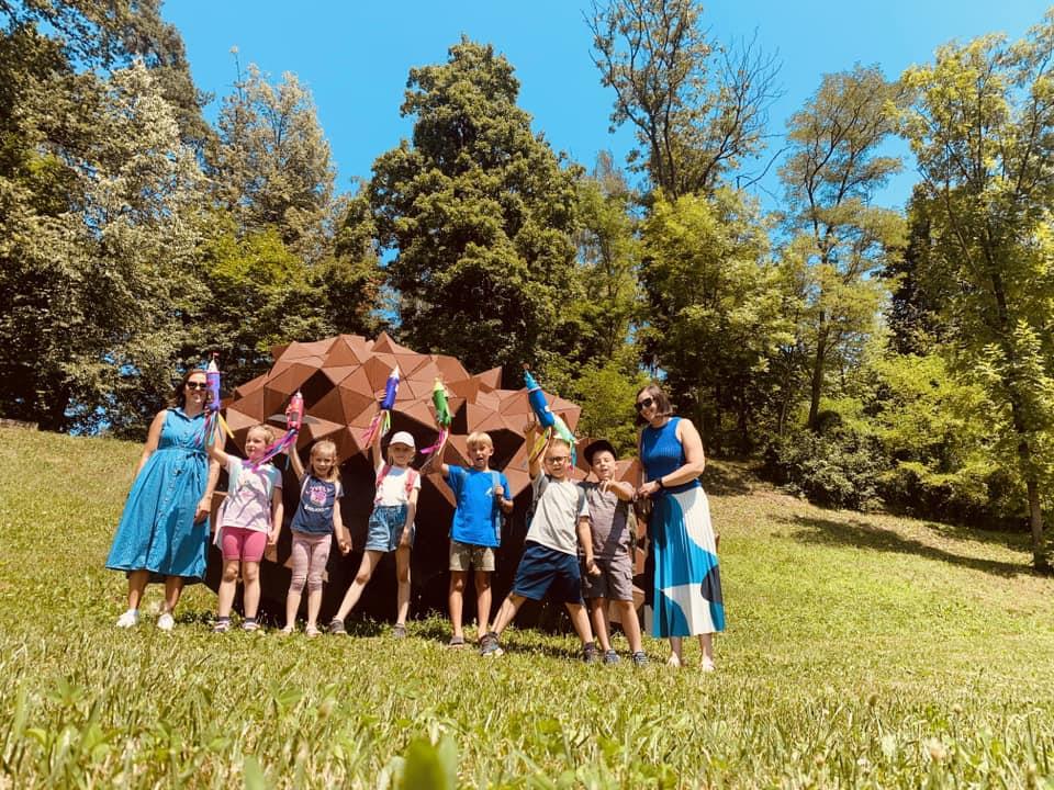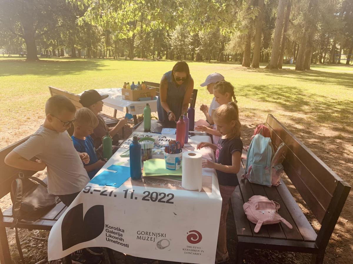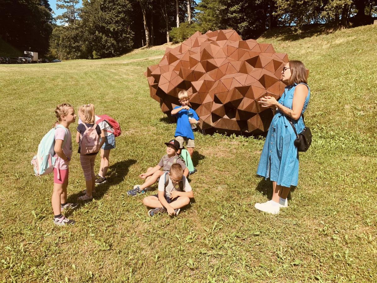 Tudi danes (ponedeljek, 15. julija) je potekalo druženje z otroki, ki so vključeni v počitniško varstvo na Ravnah. Forma viva, zbirka skulptur na prostem letos praznuje 60 let.