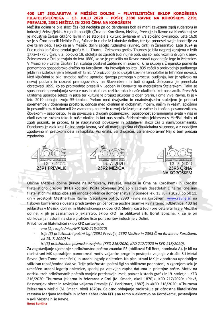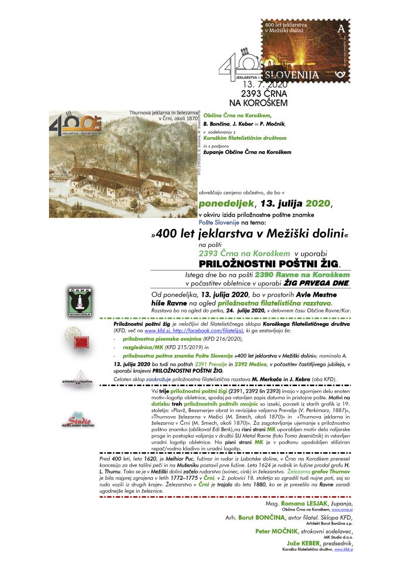 Pošta Slovenije bo skupaj z Občino Ravne na Koroškem v ponedeljek, 13. julija 2020, na novinarski konferenci predstavila priložnostni filatelistični sklop v počastitev 400-letnice jeklarstva v Mežiški dolini.